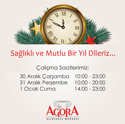 İzmir Agora AVM yilbaşı akşamı ve 1 Ocak 2016 çalışma saatleri açıklandı. Açıklanan bilgilere göre Agora Alışveriş Merkezi çalışma saatleri şu şekilde olacak;