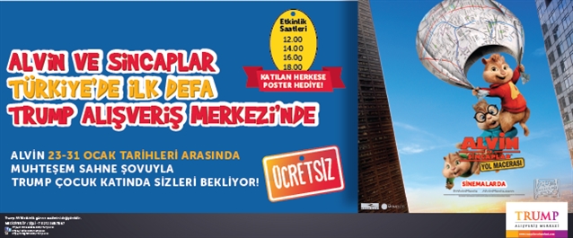 Trump AVM Alvin ve Sincaplar etkinliğine katılan herkese poster hediye. Etkinlik saatleri 12:00, 14:00, 16:00 ve 18:00 `de.