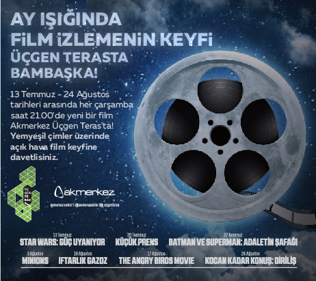 13 Temmuz- 24 Ağustos tarihleri arasında her çarşamba saat 21:00`da yeni bir film Akmerkez Üçgen Teras`ta! Yemyeşil çimler üzerinde açık hava film keyfine davetlisiniz. Program: 13 Temmuz- Star Wars: Güç Uyanıyor 20 Temmuz- Küçük Prens 27 Temmuz: Batman ve Süpermen: Adaletin Şafağı 3 Ağustos: Minions 10 Ağustos: İftarlık Gazoz 17 Ağustos: The Angry Birds Movie 24 Ağustos: Kocan Kadar Konuş: Diriliş