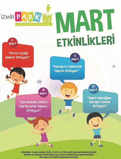 Uzman eğitmenler eşliğinde her cumartesi günü 3 seans olarak gerçekleşen Çocuk Kulübü etkinliklerine 6-12 yaş arasındaki tüm çocuklar katılabilecek. İzmir Park Çocuk Kulübü’nün Mart ayı etkinlikleri 4 Mart’ta Deniz Uçağı Maket Atölyesi ile başlayacak. 11 Mart’ta Kanguru Kalemlik Yapım Atölyesi’nde kendi eşyalarını tasarlayacak olan minikler, 18 Mart’ta ise Çanakkale Zaferi’nin 102’nci yılı kapsamında bugüne özel kartpostallar yapıp şehitleri anacak. Çocuk Kulübü’nün Mart ayı programı 25 Mart’ta gerçekleşecek Mavi Papağan Sünger Kukla Atölyesi ile sona erecek.