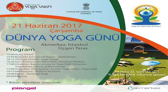 Mert Güler ve Türkiye`de hizmet veren farklı yoga okulları da her seviyeye uygun yoga çalışmaları, nefes ve kişisel gelişim konularında söyleşi ve aktiviteler gerçekleştirecek.Tüm aktivitelerin ücretsiz olduğu etkinlikte misafirler gün boyu yoga uygulamalarını deneyebilecek.Program detayları: Yer: Akmerkez Üçgen Teras Tarih: 21 Haziran Çarşamba 15:00 Açılış (Müzik Dinletisi) 15:45 Büyükler İçin Çocuk Yogası (Siddashram Yoga Okulu) 16:15 “Zihinsel Detoks” (Yoga Darga) 16:30 “Aşk İle Gülümse” (Mert Güler Meditatif Rehber) 17:00 Hindistan Başkonsolosu ve Yoga Vakfı Kurucusu Yogi Adnan Çabuk`un Uluslararası Yoga Günü Konuşmaları 17:30 Yoga Akışı ( Pranayama / Asana / Yoga Nidra ) (Yoga Vakfı) 19:15 Meditasyon (Brahma Kumaris) 19:40 Canlı Müzik: Kirtan (Goranga Yoga) 20:30 Kapanış