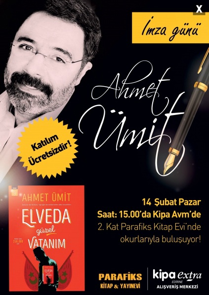 Daha çok polisiye olmak üzere bir çok kitabı yayınlanan değerli yazar Ahmet Ümit Edirne Kipa AVM de okurlarına imza dağıtacaktır. Son kitabı olan "Elveda Güzel Vatanım" kitapçılarda yerini almıştır. 14 Şubat Pazar saat 15:00 da imza gününe siz değerli okurlarını bekler.