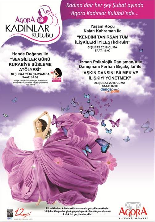 İnsan olmanın vesilesidir. Havva`dır kadın. Sevgilinin can damarı Amine`dir. Latife eş Hatice`dir. Bir iffet abidesi Meryem`dir.Hayatın can damarıdır.İçinizdeki vicdandır.Eş, anne, kardeştir.Herdaim ailesinin arkasındadır.Hayatın olmazsa olmazı mutluluğun tek kahramanıdır.Agora AVM kadını sevdi ve kadınlar kulübü ile her daim kadınların yanında olacaktır.Şubat ayında farklı etkinlikler ile kadınlarla buluşuyor.